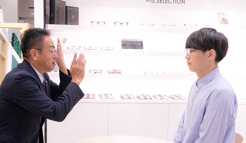 ぴしっとしたスーツ姿の森さん。普段、スタッフ教育をされていることもあって、会った瞬間から非常に安心感があります。さっそく相談してみると、時間が経つにつれてメガネがゆるんでくる悩みは、“よくある話”だということが分かってきました。