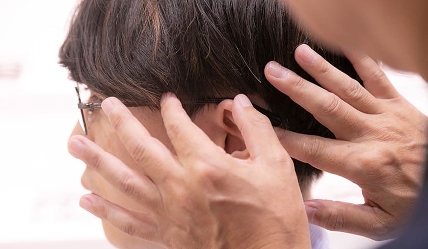 最初に、目の位置の左右差や現状のメガネのずれ具合を確認します。