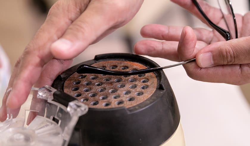 森さん「メガネがだんだんずれてくる一番の原因は、実はメガネのかけ外しなんです。メガネをかけるときには、テンプルのすぼまったところが頭蓋骨の広がっている部分を通るので、そのときにテンプルが少しずつ広がってしまうんです。
