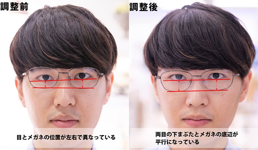 調整前との大きな違いは、目とレンズのバランスがほぼ左右均一になっている点です。目の位置の左右差に合わせて、メガネも「まぶたの下と、メガネのアンダーリム(縁の下側)の距離」が左右で同じになるようにそろえています。